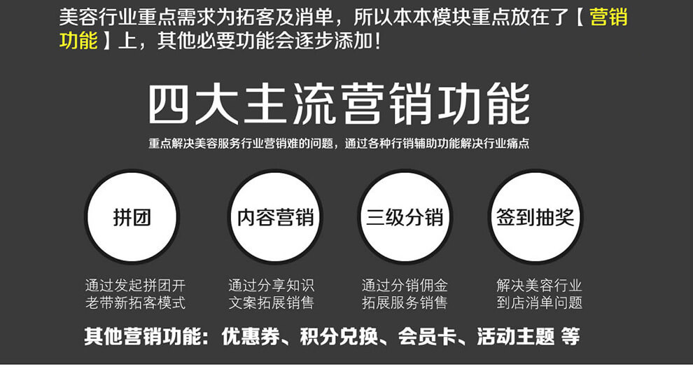 本模块可拓展到适应更多的多服务行业!!!分销、拼团、秒杀、砍价、直播购物。签到大转盘抽奖、三级分销功能(可自由切换一级二级三级)、活动文章分享、手机管理功能、买单功能、客服、多门店、技师、预约、项目、增加管理员手机端关闭指定日期预约功能.....